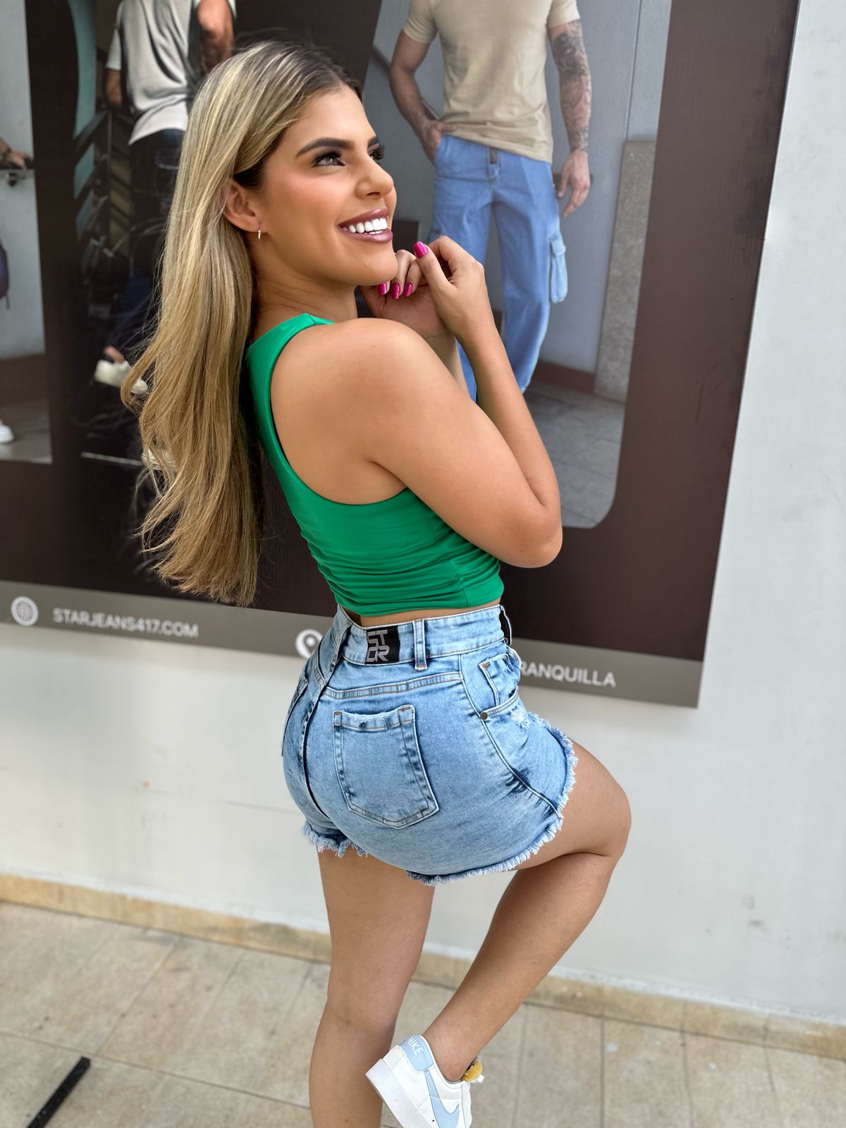 short para dama tela strech tono sky con flecos